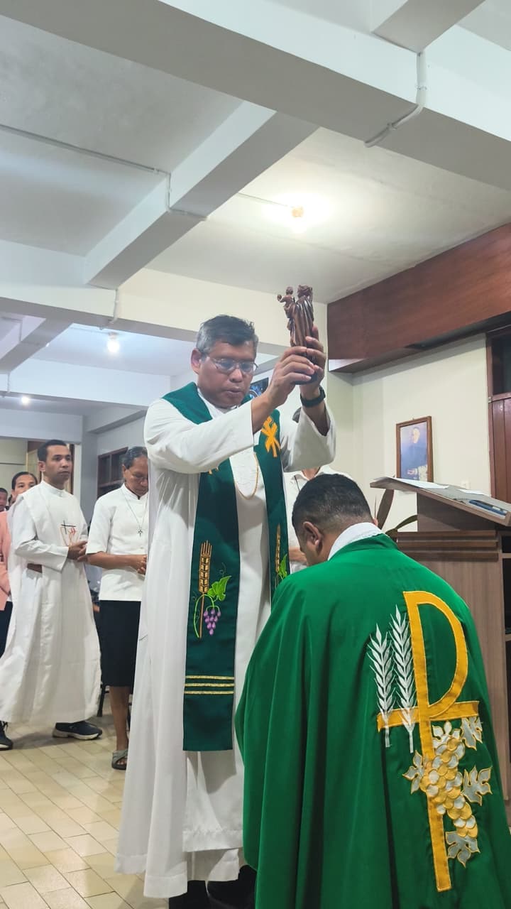 Momen paling menyentuh terjadi di akhir Misa. Mengikuti tradisi khas Kongregasi SS.CC., Romo Felix menerima berkat khusus dari Bunda Ratu Damai, pelindung para misionaris SS.CC., yang diiringi doa bersama dari para saudara dan saudari se-kongregasi sebagai bekal penguatan di medan misi yang baru.