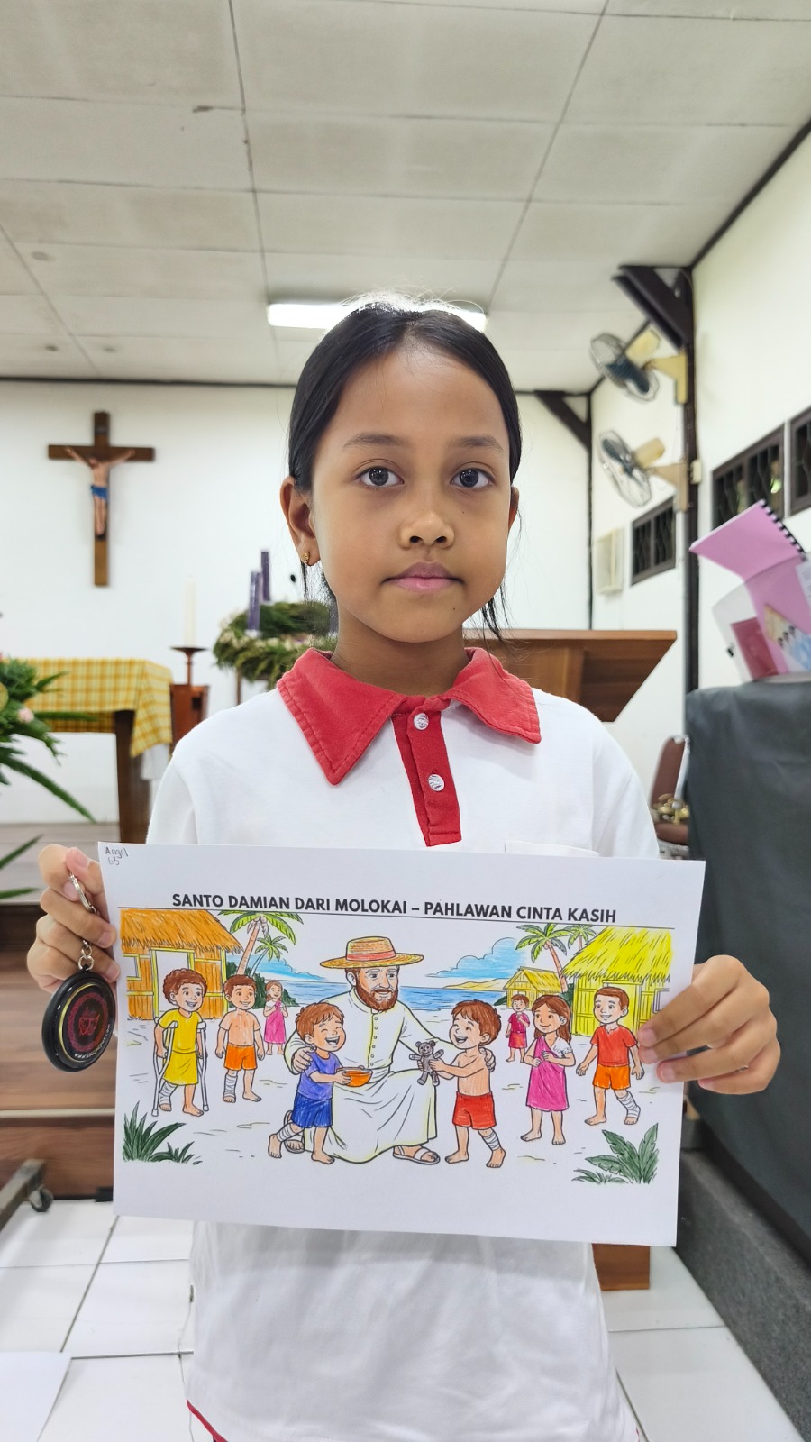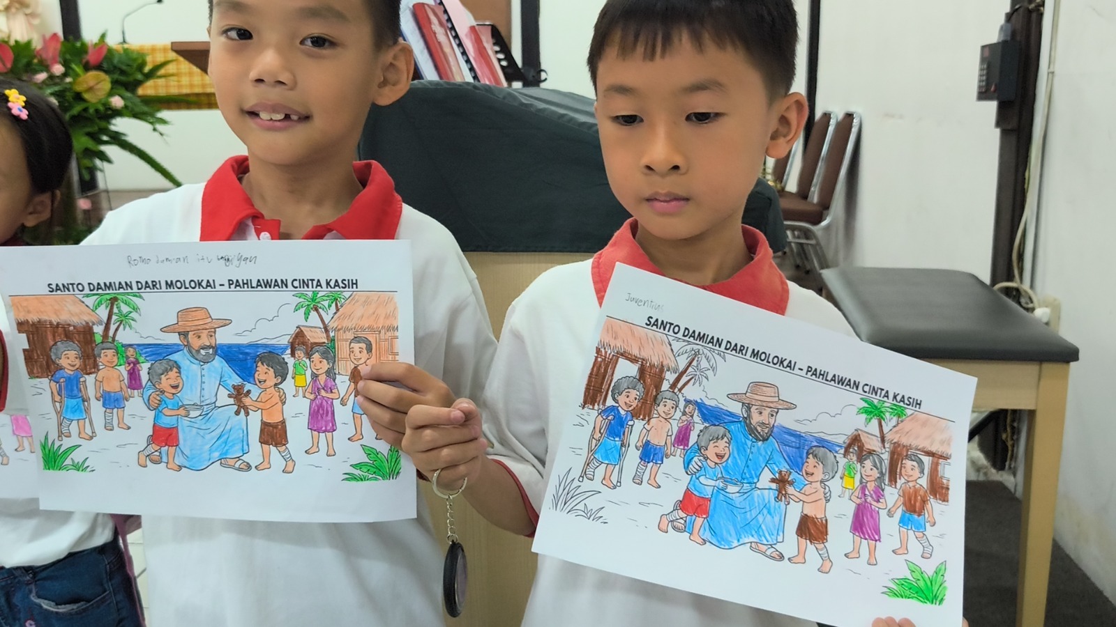 Sesi dimulai dengan mendengarkan kisah inspiratif Santo Damian de Veuster. Peserta tampak larut menyimak bagaimana Santo Damian mendedikasikan hidupnya untuk melayani orang-orang yang terbuang. Untuk memvisualisasikan kisah tersebut, anak-anak diajak mewarnai gambar Santo Damian yang sedang melayani anak-anak di Pulau Molokai.